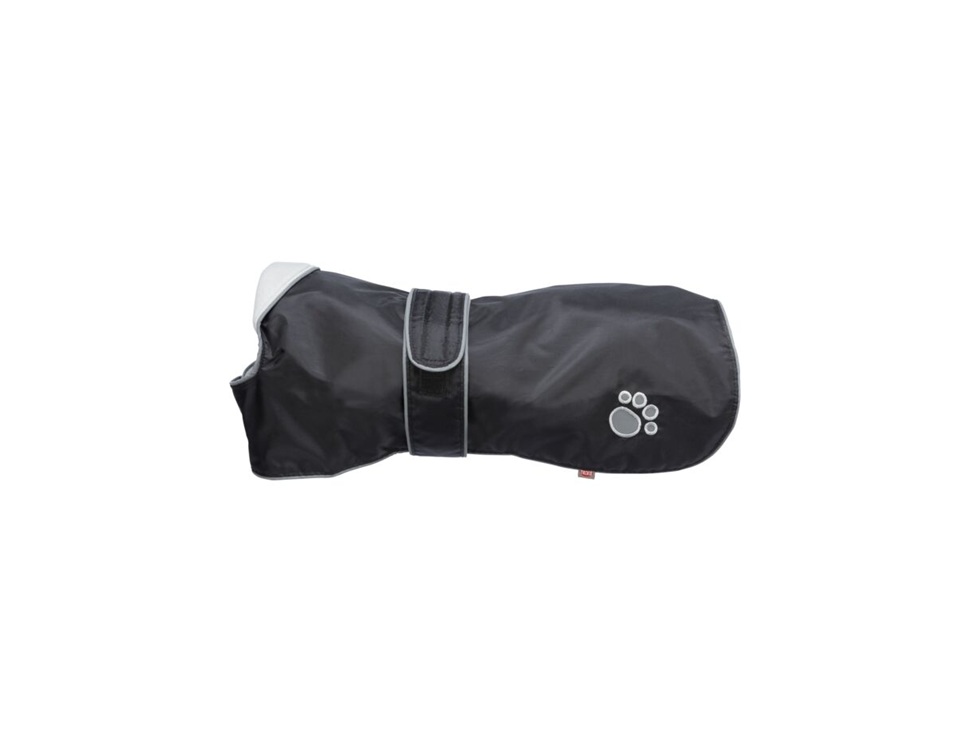 Dekken i slitesterkt nylonstoff med innerfôr i fleece. Reflekterende kantbånd og potemotiv. Med bakbensstropper. Med borrelåsbånd.