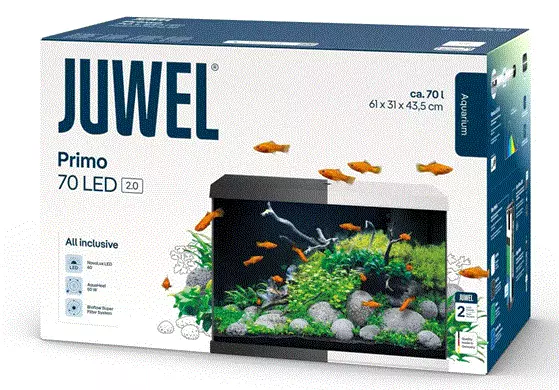 Den spesielle utformingen av Primo-lokket betyr at eventuell kondens ledes tilbake til akvariet når det er lukket. En integrert flat kan brukes til å fôre fisken og er kompatibel med JUWEL automatiske mater.