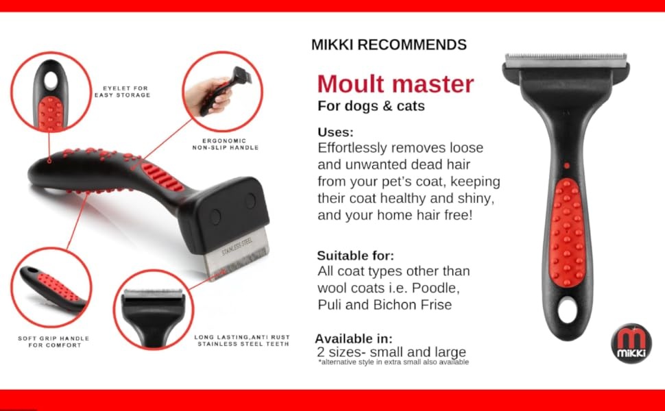 Mikki Moult Master er designet med tanke på profesjonell bruk for å spare deg tid og energi. Den er enkel å bruke med et mykt, ergonomisk håndtak og sterke, lette keramiske tenner for holdbarhet og komfort. Det mindre hodet og de keramiske tennene gir en jevn og presis pelspleie, spesielt for mindre kjæledyr, og etterlater kjæledyret ditt velstelt på kort tid.