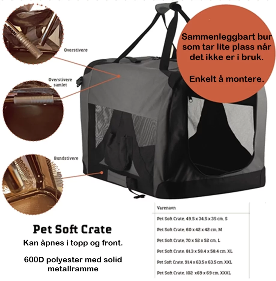 Sammenleggbart transportbur, kan åpnes i topp og front, 600D polyester med metalramme. Antracitgrå.