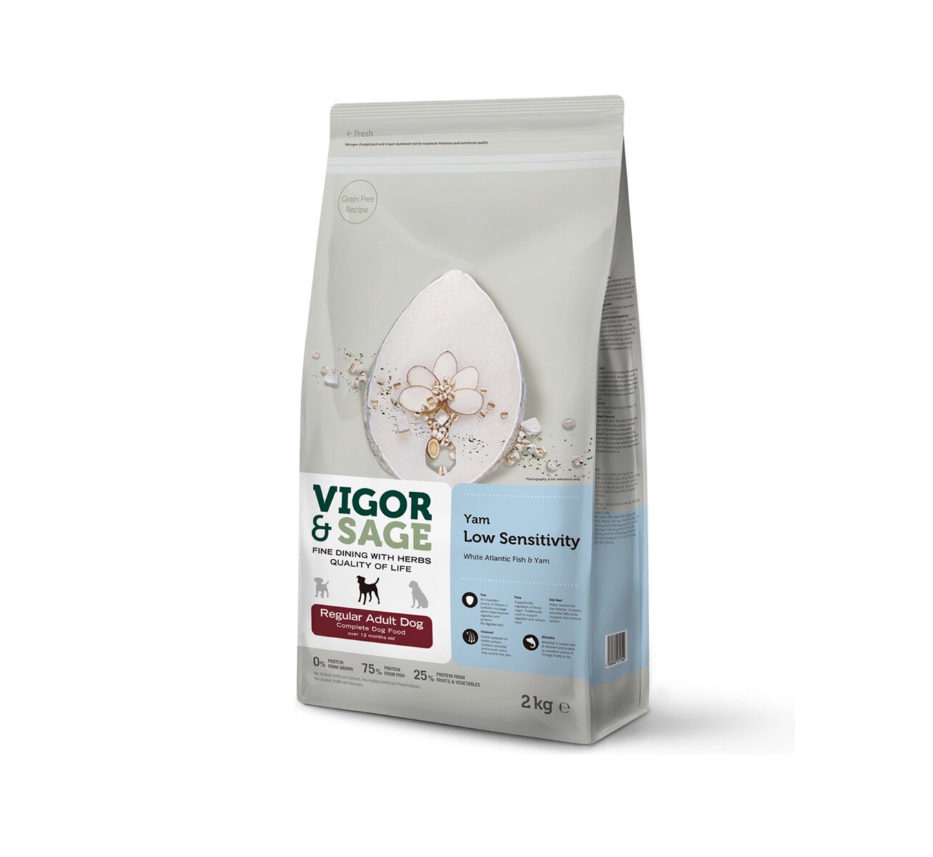 Vigor & Sage Low Sensitivity Yam Adult Dog er et hypoallergenisk komplettfôr spesielt formulert for hunder med sensitiv mage eller matintoleranser. Fersk atlantisk hvitfisk brukes som eneste proteinkilde og er kombinert med yam og poria for å redusere betennelse i tarmen og forbedre næringsopptaket. Den fiberrike formelen (5,5 %) bidrar til en balansert tarmflora, og prebiotika (FOS) støtter et sunt mikrobiom. Innholdet er fritt for vanlige allergener og er egnet for voksne hunder av alle raser. Et mildt, skånsomt og næringsrikt alternativ for sensitive mager.